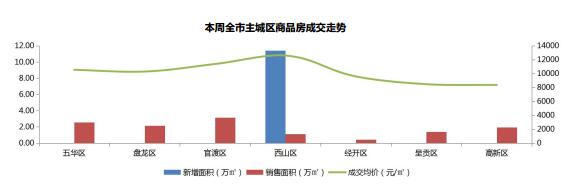 本周成交主力為官渡區,其成交總量占主城區成交量的24.57%;其次為五華區和盤龍區,成交量分別占主城區成交量的20.07%、16.97%;本周西山區有新增供應。
