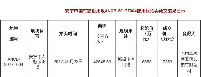 9月22日,位于昆明太平新城的1宗住宅用地在安寧國土局拍賣交易,該地塊編號為ANCB-2017T004號,出讓面積共42645.63平米(約64畝),拍賣起價為6653萬元,容積率>1.0≤1.6。據安寧市國土資源局土地成交結果顯示,該地塊被云南玉龍灣旅游發展有限公司溢價600萬元,以7253萬元的價格獲得,土地單價為113萬元/畝,樓面價為1063元/平米。