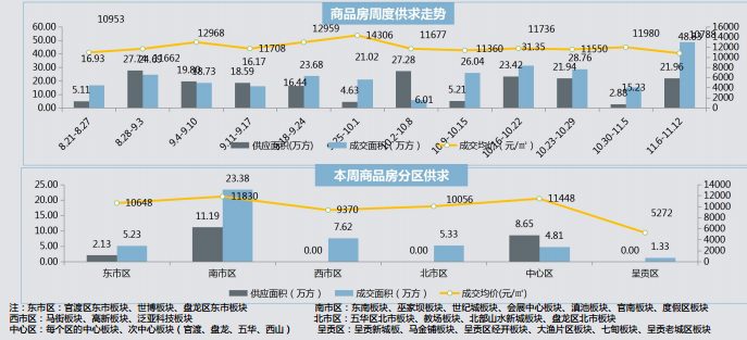 從各區域來看,本周南市區以11.19萬方,供應量排在第一,為主力供應區域,東市區、西市區、北市區、呈貢區本周無新增供應.