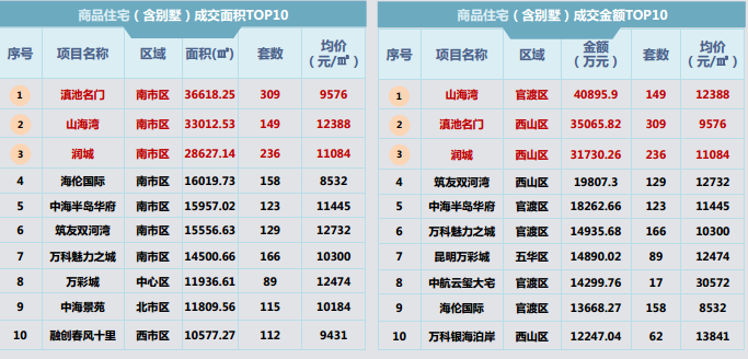 本周成交41.01萬方,環比增長205.6%,前期開盤項目集中備案,成交大幅增長,主力成交項目為滇池名門、山海灣等。