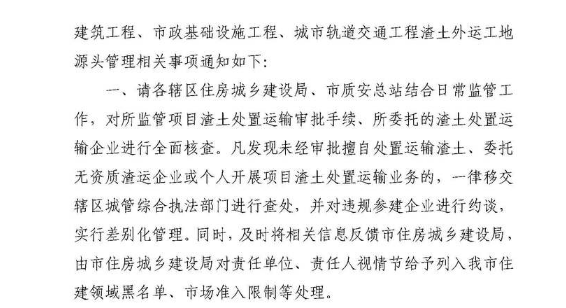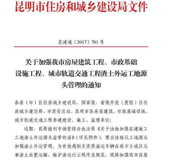 日前,昆明市住房和城鄉建設局發布了《關于加強我市房屋建筑工程、市政基礎設施工程、城市軌道交通工程渣土外運工地源頭管理的通知》,要求協助從工地源頭加強渣土外運管理,遏制無資質渣運車輛在昆明市主城區從事渣土處置運輸。
