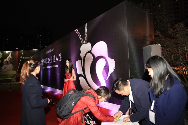 晚上6點,應邀媒體及賓客陸續到場,在西城時代營銷中心門口巨大的主題背景板上留下了自己的名字。這一道道金色的流線,書寫了來賓們與西城的緣分;也代表了西城足金般的高品質服務。