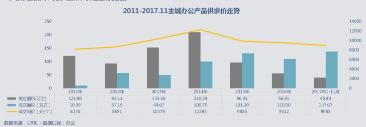 辦公供應(yīng)從2011年到2017年,總體上供應(yīng)量上升,2014年達(dá)到頂點(diǎn),辦公存量較大,房企對(duì)后期市場(chǎng)不看好,2015年后