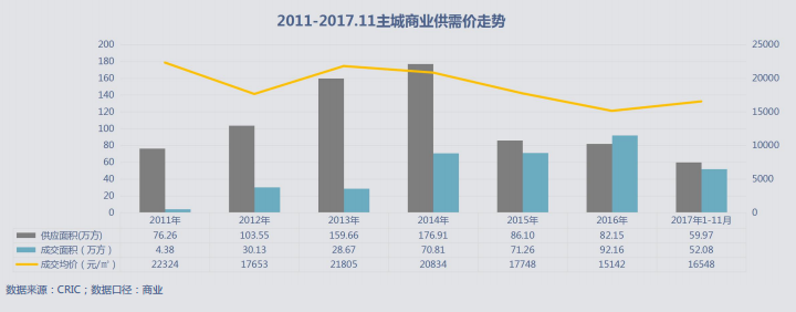 從成交價(jià)格方面看,2011—2017年1-11月,整體成交價(jià)格呈下降趨勢(shì),2016年,均價(jià)下滑至15142元/㎡,2017年整體市場(chǎng)商業(yè)地產(chǎn)存量大,同質(zhì)化競(jìng)爭(zhēng)加劇,結(jié)構(gòu)性問(wèn)題突出和去庫(kù)存的壓力,成交均價(jià)16548元/㎡,環(huán)比上升7.37%。