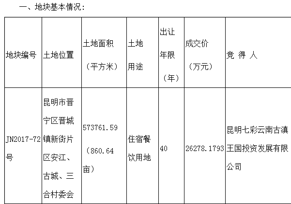 根據《中華人民共和國土地管理法》、《中華人民共和國城鎮國有土地使用權出讓和轉讓暫行條例》、《招標拍賣掛牌出讓國有建設用地使用權規定》等有關法律、法規規定,經昆明市晉寧區人民政府批準,遵循公開、公正、公平的原則。晉寧市國土局于2017年12月4日至2017年12月15日掛牌出讓昆明市晉寧區晉城鎮新街片區安江、古城、三合村委會860畝商業用地,昆明七彩云南古滇王國投資發展有限公司拿地。現將有關情況公示如下: