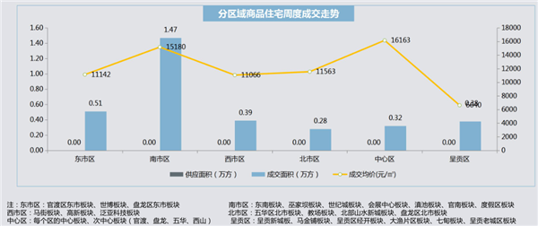 本周成交集中在南市區(qū),成交1.47萬方,占比15.2%,其余各區(qū)成交較為平均,相差較小