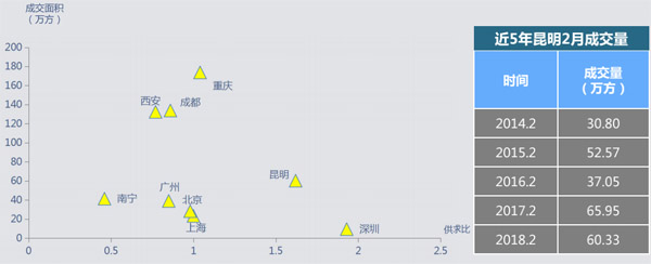 2018年2月,與對標城市相比,昆明成交量居中位,供求比值較高,排名第二。8城市供求比只有昆明,重慶,深圳超過1,在成交量方面,8城均有不同程度的下滑。