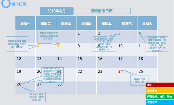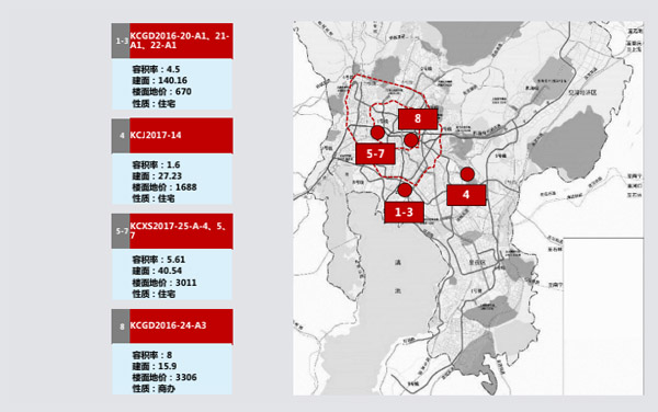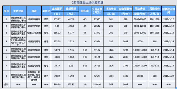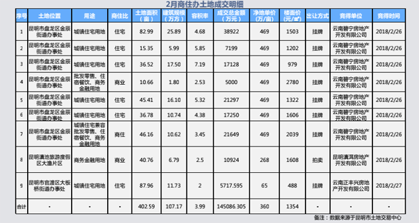 據本機構統計,截止到2018年2月28日,昆明市土地交易中心和昆明市國土資源公示供應商住辦土地共8宗,擬出讓占地面積共計57.38萬平米,出讓綜合價金共31.45億元。