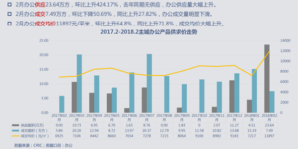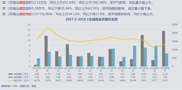 開年第二個月,供應量大幅上升、成交量大幅下滑,由于商業、辦公成交價格大幅攀升,整體拉高成交均價。