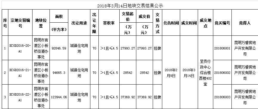 昆明市官渡區小板橋街道辦事處(KCGD2016-20-A1)地塊交易結果公示