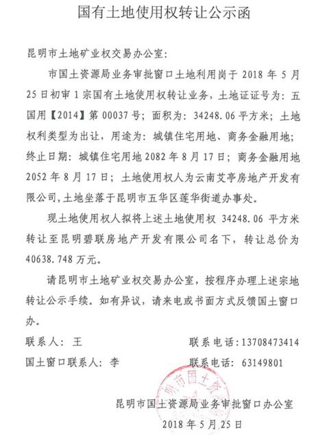 根據文件,云南艾亭房地產轉讓的土地證證號為五國用[2014]第0037號,面積為34248.06平方米(約合51.37),土地權利類型為出讓,土地用途為城鎮住宅用地、商務金融用地。土地坐落于昆明市五華區蓮華街道辦事處,土地將轉至昆明碧聯房地產名下。