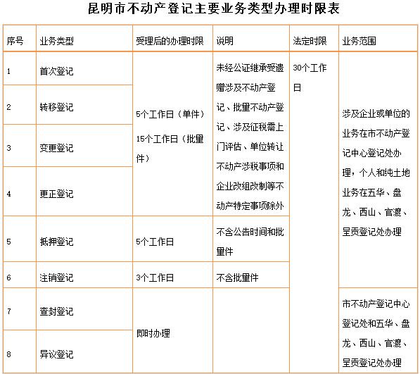 一、自2018年7月1日起,除查封登記、異議登記即時辦結(jié),政府組織開展的農(nóng)村不動產(chǎn)登記、未經(jīng)公證繼承受遺贈涉及不動產(chǎn)登記、批量不動產(chǎn)登記、涉及征稅需上門評估、單位轉(zhuǎn)讓不動產(chǎn)涉稅事項(xiàng)和企業(yè)改組改制等不動產(chǎn)特定事項(xiàng)外,原則上昆明市主城區(qū)范圍內(nèi)實(shí)行不動產(chǎn)登記5個工作日辦結(jié)(具體業(yè)務(wù)類型和辦理時限詳見附表)。