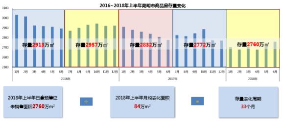 【存量】截止2018年6月商品房存量2760萬㎡,較2017年底下降了12萬㎡;按照2018年下半年月均去化84萬㎡計算,還需33個月消化。