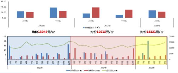 寫字樓市場:2018年上半年寫字樓新增量27.47萬㎡,成交22.57萬㎡,成交均價13321元/㎡;存量275.21 萬㎡,按照 2018年上半年月均去化3.76萬㎡,需73個月(約6年)消化,呈現了一般去庫存狀態,存量較大,去化任務艱巨。
