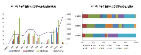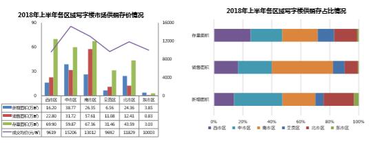 【供銷存價對比】2018年上半年寫字樓新增主力為中市區,占比33%;銷量主力為南市區,占比42%;西市區、中市區 和南市區存量較大,三區域占比達72%;中市區售價最高15206元/㎡。