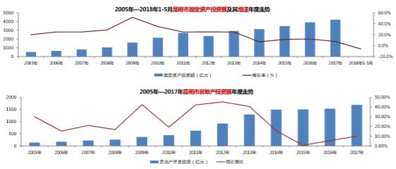 【固定資產投資和房地產投資】2017年昆明市規模以上固定資產投資完成4217.94億元,同比增長7.60%,2018年固定資產投資同比下降5.9%;房地產投資額為1683.33億,約占全昆明規模以上固定資產投資總額的10.00%。