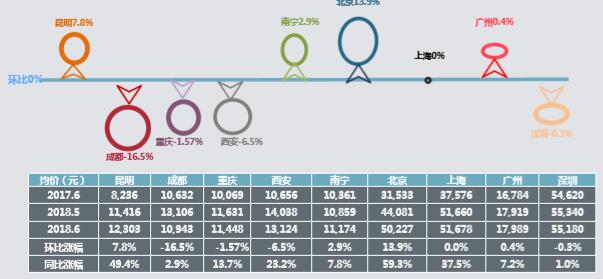 本月昆明均價小幅上漲,監(jiān)測城市中,除成都、西安、深圳小幅下降,其他城市本月均價不同程度的上漲。