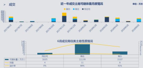 從數(shù)據(jù)上來看,6月商住類土地成交面積37.10萬平米,環(huán)比上漲281.29%,同比下降67.02%。建筑面積163.11萬方,樓面均 價3211元/㎡,其中9宗土地拍賣出讓,其余土地均為掛牌底價成交,平均溢價率73.11%。