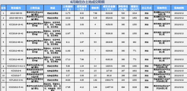 截止到2018年6月30日,昆明市土地交易中心和昆明市國土資源公示已成交商住辦土地共21宗,成交土地面積37.10萬平米,成 交金額30.26億元,平均地價941萬元/畝。