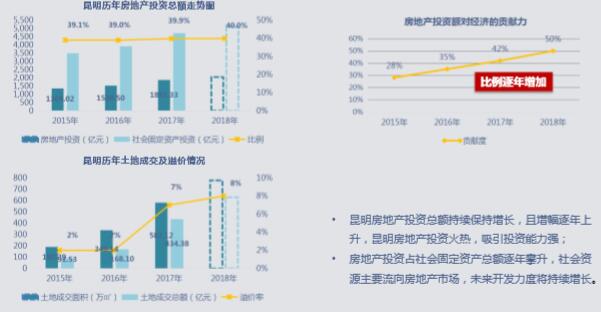 宏觀數據——昆明房地產投資逐年增加,經濟的最主要的貢獻來源于房地產,土地市場活躍,昆明市房 地產投資火熱,大量資金流入地產行業,將持續處于繁榮期,各項經濟指標均有不同程度的攀升。
