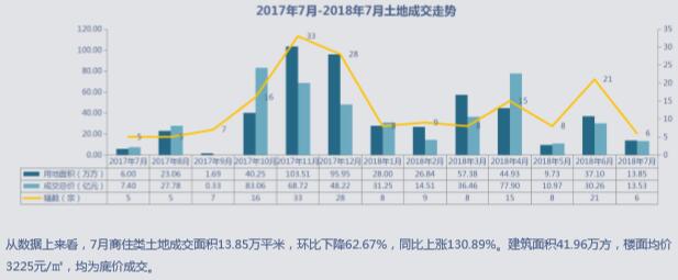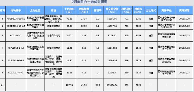 截止到2018年7月31日,昆明市土地交易中心和昆明市國土資源公示已成交商住辦土地共6宗,成交土地面積13.85萬平米,成 交金額13.53億元,平均地價651萬元/畝。