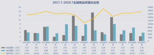 7月商業成交均價17497元/平米,環比上升5.87%,同比上升13.1%,均價小幅上升。