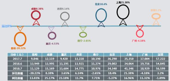 本月昆明商品房均價(jià)有所下降,監(jiān)測(cè)城市中,除成都、西安、北京、上海、深圳均價(jià)上漲外,其余城市本月均價(jià)都有不同程度的下滑。