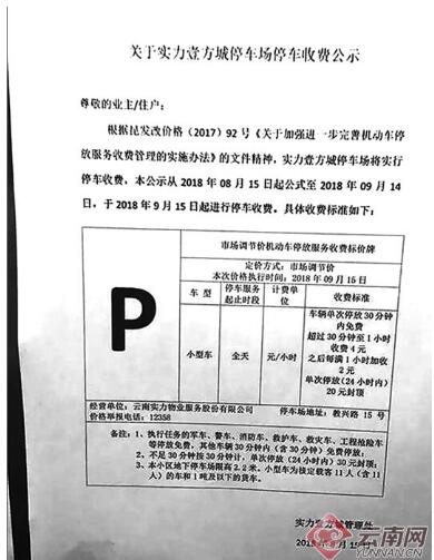 8月15日,小區業主看到實力壹方城管理處在小區內張貼的停車場收費公示,該小區定于9月15日正式收取停車費。公示顯示,小型車單次停放30分鐘內免費,30分鐘到1小時收費4元,之后每滿1小時加收2元,單次停放24小時內20元封頂。