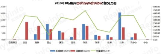 呈貢板塊銷量最多,為13.49萬方,其次為東南和高新板塊,分別為10.48和10.45萬方;其中東南板塊商品房存量依舊最 大,為441.07萬方。