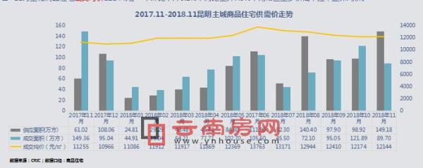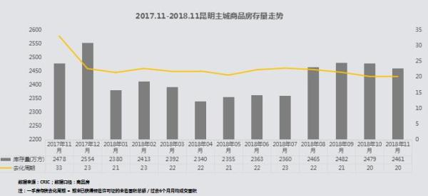 供應放緩,市場需求不減,庫存增長放緩,去化周期與上月持平;11月,昆明市場可售面積2461萬方,同比減少18萬方,政府以穩定市場為主。
