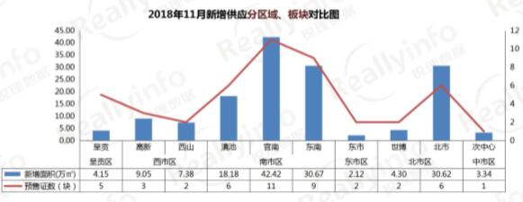 本月昆明新增供應(yīng)主力為南市區(qū),供應(yīng)91.27萬方,占比60%;其次為北市區(qū),供應(yīng)34.92萬方,占比23%。本月新增預(yù) 售項(xiàng)目中,保利堂悅、碧桂園北城映象、中建龍熙壹號(hào)、恒泰滇池名門、紅星天鉑、萬科中天北宸、中交金地中央公園、 金地九樾等項(xiàng)目進(jìn)行了開盤推售。
