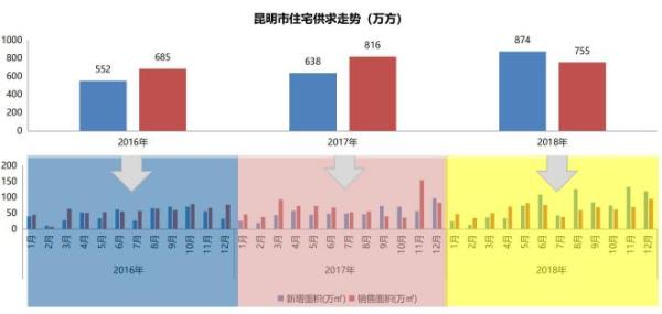 【整體供銷】2018年新增供應(yīng)874萬(wàn)㎡,同比上漲37%;銷量755萬(wàn)㎡,同比下降7%。(數(shù)據(jù)只含普通商品住宅,不含政策房)