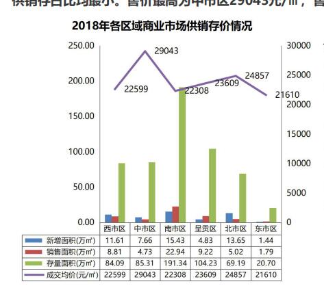 【區(qū)域供銷存價(jià)對(duì)比】2018年商業(yè)供銷存均是南市區(qū)占主力(供占28%,銷占44%,存占34%)。東市區(qū)