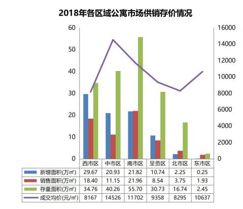 【區(qū)域供銷存價(jià)對(duì)比】2018年公寓新增供應(yīng)西市區(qū)最多,占比35%;南市區(qū)銷量最高,占比33%;存量也