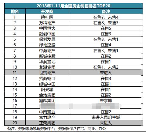 【房企集中度——全國(guó)銷售前十 】截止2018年底,全國(guó)排名前20開(kāi)發(fā)商僅有2家未進(jìn)入昆明。全國(guó)前20開(kāi)發(fā)商2018年昆明銷售額占比38%。