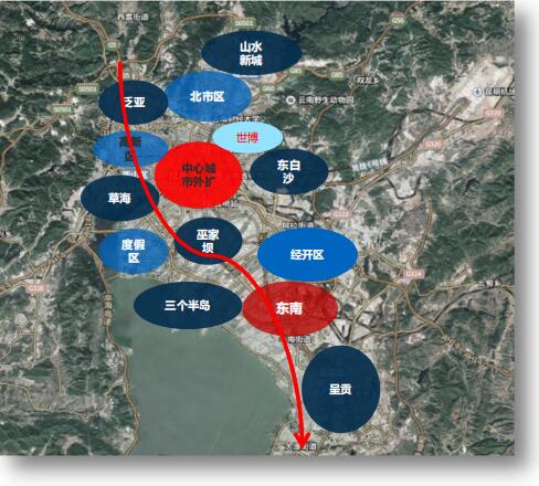【城市發展格局—主城區】昆明中心城區對外擴張已有多年,整體來看,昆明東西南北各方向均有規劃發展,但由于盆地地形的影響(東、西、北三面靠山,僅南面具有大面積開闊土地),昆明主力發展向南環滇池發展。