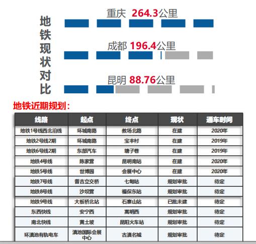 【城市交通—地鐵】昆明地鐵總體規劃里程562公里,目前投入運營88.76公里,日均軌道交通客運量近50萬人次。未來昆明地鐵主要延城市發展脈絡向南北向拓展,以交通帶動經濟、信息、人力等資源的流動,帶動南北區域發展。