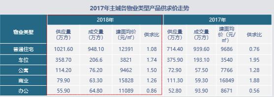 分類產(chǎn)品對比:2018年各類產(chǎn)品供應(yīng)充足,商品住宅供求相對平衡,其中公寓、車位、商業(yè)、辦公產(chǎn)品仍 然以去庫存為主。