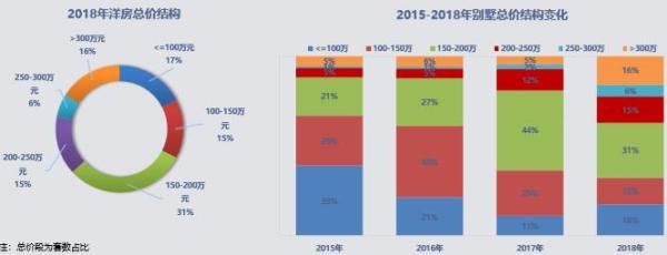 別墅總價段:總價上漲,中端主力,高端微漲,200萬以下低總價產(chǎn)品份額下跌。