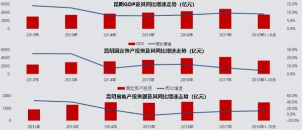 2018年1-10月份,昆明地區生產總值3506.78億元,同比增長9.1%;2018年1-10月昆明市規模以上固定資產投資完成3317.63 億元,同比上漲4.40%;房地產投資額為1483.61億,約占全昆明規模以上固定資產投資總額的44.72%。