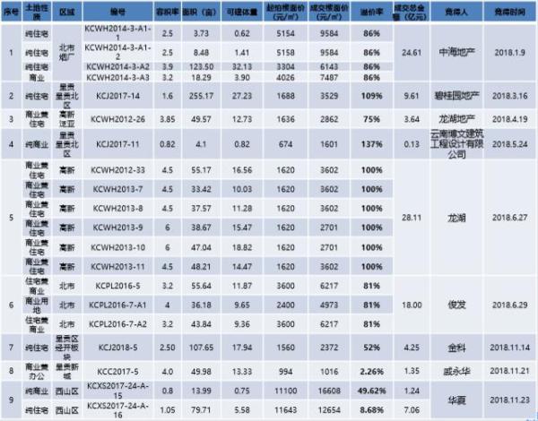 高溢價土地:2018年高溢價土地主要分布昆明西北新城、和崛起的經開片區,年度最高溢價率86%;