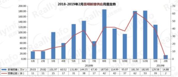 本月昆明房地產市場公布了2塊預售證,其中融城春曉未公布房間明細,新增供應面積為14.88萬方(統計口徑以公布房間明 細為準) ,環比下降88.52%,同比下降50.10%。