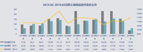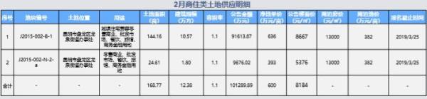 據本機構統計,截止到2019年2月28日,昆明市土地交易中心和昆明市國土資源公示供應商住辦土地共2宗,擬出讓占地面積共 計11.25萬平米,出讓綜合價金共10.13億元。