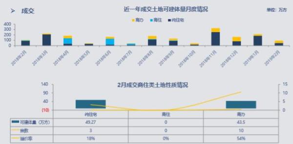 從數據上來看,2月商住類土地成交面積27.02萬平米,環比下降69.29%,同比上升0.67%。建筑面積103.86萬方,樓面均價 2757元/㎡,其中錦藝置業、德商置業地塊溢價成交外其余土地均為底價成交。