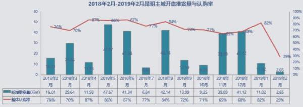 2019年2月昆明主城商品住宅推盤3次,共計推出2.65萬方,成交0.78萬方;本月正值春節節點,開發商年初盤整,項目 體量供應放緩,開盤項目較少,一共三個項目開盤,推出199套房源,去化率29%。