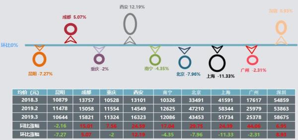 2019年3月監測城市中,節后供貨節奏恢復,低價市場成交較多,均價環比3漲6跌,西安變化幅度最大,其它城市房價維穩,變化幅度較小。