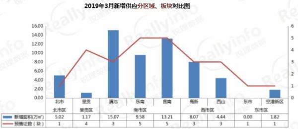 供應(yīng):本月除中市區(qū)外其余區(qū)域均有新增面積,其中南市區(qū)新增量最多,為24.11萬方;