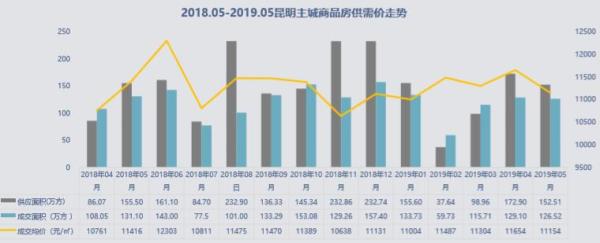 2019年5月昆明主城商品住宅推盤8次,推出1049套房源,去化率73%。推出體量合計12.61萬方,成交9.15萬方;3、4月小陽春5月沒有得到延續,樓市經歷了春節后一波小高潮后,樓市熱度下降。結合政府調控目標來看,穩定是雙向調節, 預計后期價格維穩,房價上漲動力偏弱。