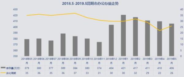 2019年5月辦公市場以去庫存為主,庫存量有下降趨勢,但仍保持高位,但去化周期有所縮短。