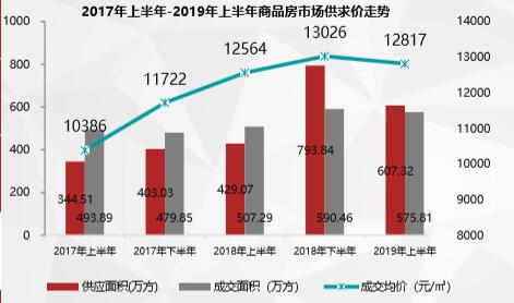 2019年上半年商品房市場供應607.32萬方,同比上升41.54%,市場供應潛力較強;成交量達575.81萬方,同比增長13.51 %,需求釋放;成交均價約12817元/平方米,同比增長 2.02%;同比較去年同期均價呈現上漲,在限購政策調控下,價格趨穩;存量1339萬方,受限售政策影響,去化周期縮短至11個月。